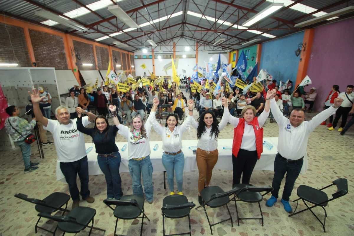 Morelia, Mich., a 3 de Marzo dle 2024.- Con la fortaleza de los partidos Revolucionario Institucional (PRI), de la Revolución Democrática (PRD), y de Acción Nacional, la alianza Fuerza y Corazón por México ganará está contienda electoral, en la que defenderemos la democracia y el voto, afirmó la candidata al Senado de la República, Araceli Saucedo Reyes, durante un encuentro con la ciudadanía en Pátzcuaro y la aspirante a la diputación federal Alejandra Velázquez.En el encuentro con la población afirmó que desde el Senado lucharán por la seguridad de ciudadanos, quienes anhelan desarrollo, vivir en paz y ver a sus autoridades y representantes populares trabajando unidos, con ellos y para ellos.Asimismo refirió que desde el Senado se luchará por una amplia reforma a la Ley de Coordinación Fiscal, para garantizar que los estados y municipios reciban mayores recursos para obras y acciones.«Esta campaña está impulsada por el corazón, lo que nos permitirá establecer un diálogo cercano con la ciudadanía de manera permanente», enfatizó la candidata.Asimismo, destacó la importancia de escuchar y tomar en cuenta las opiniones de diversos sectores, incluyendo prestadores de servicios, artesanos, migrantes y residentes locales. «Con su conocimiento y aportaciones, podremos elaborar iniciativas legislativas que realmente impulsen el progreso de Michoacán», añadió Araceli Saucedo.La coalición Fuerza y Corazón por México, conformada por el PRI, PAN y PRD, reafirma su compromiso con el bienestar y el desarrollo de Michoacán, impulsando una campaña basada en el diálogo, cercanía con la gente y propuestas concretas para el progreso del estado.