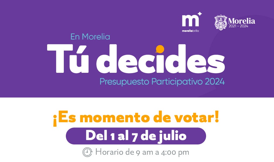 Morelia, Mich., 27 de junio de 2024.- Del 1 al 7 de julio, las morelianas y los morelianos podrán votar y elegir los proyectos ciudadanos en el programa de Presupuesto Participativo 2024, iniciativa que impulsa el Presidente Municipal, Alfonso Martínez Alcázar.