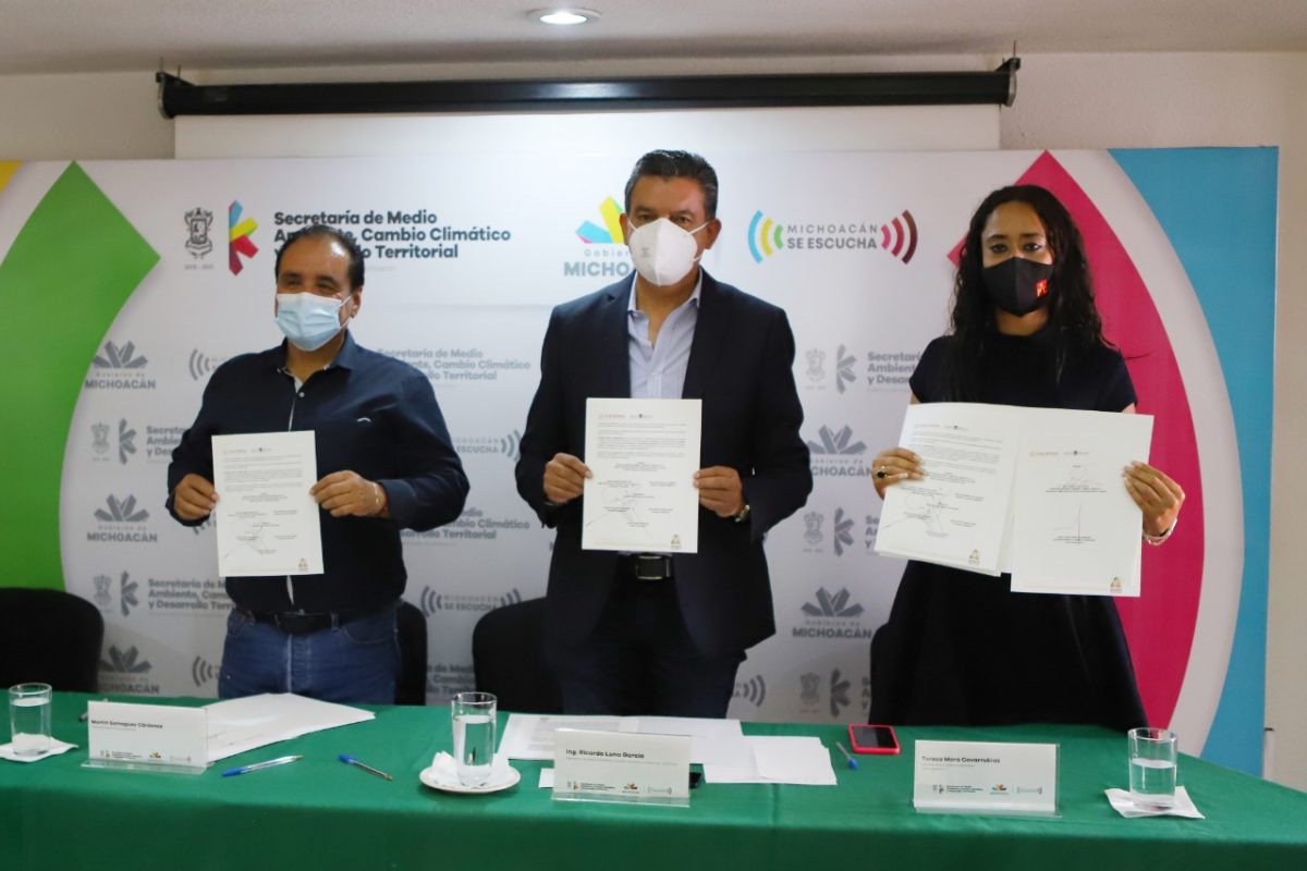 Morelia, Mich., a 28 de Octubre de 2020.- Para conocer la viabilidad técnica del proyecto con el cual se busca implementar un organismo público municipal que permita a Zamora contar con un sistema de recolección, manejo, tratamiento y disposición final de residuos sólidos urbanos, se firmó un convenio de adhesión financiera entre el edil Martín Samaguey Cárdenas, la Secretaría de Medio Ambiente, Cambio Climático y Desarrollo Territorial, que encabeza Ricardo Luna García y Banobras a través del Fonadin.